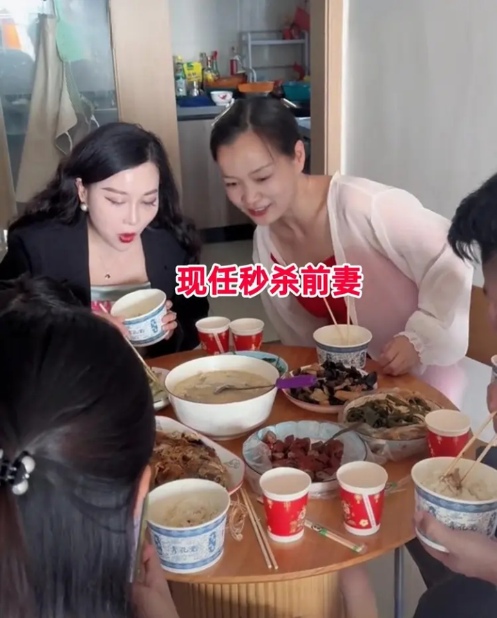 前妻现任和男子一起吃饭时,前妻对男子调侃道:“李婷做的菜都比你好吃,真是便宜你了!” 现任淡淡一笑,让她多吃点,两人又说又笑,现任还往前妻身边靠了靠。